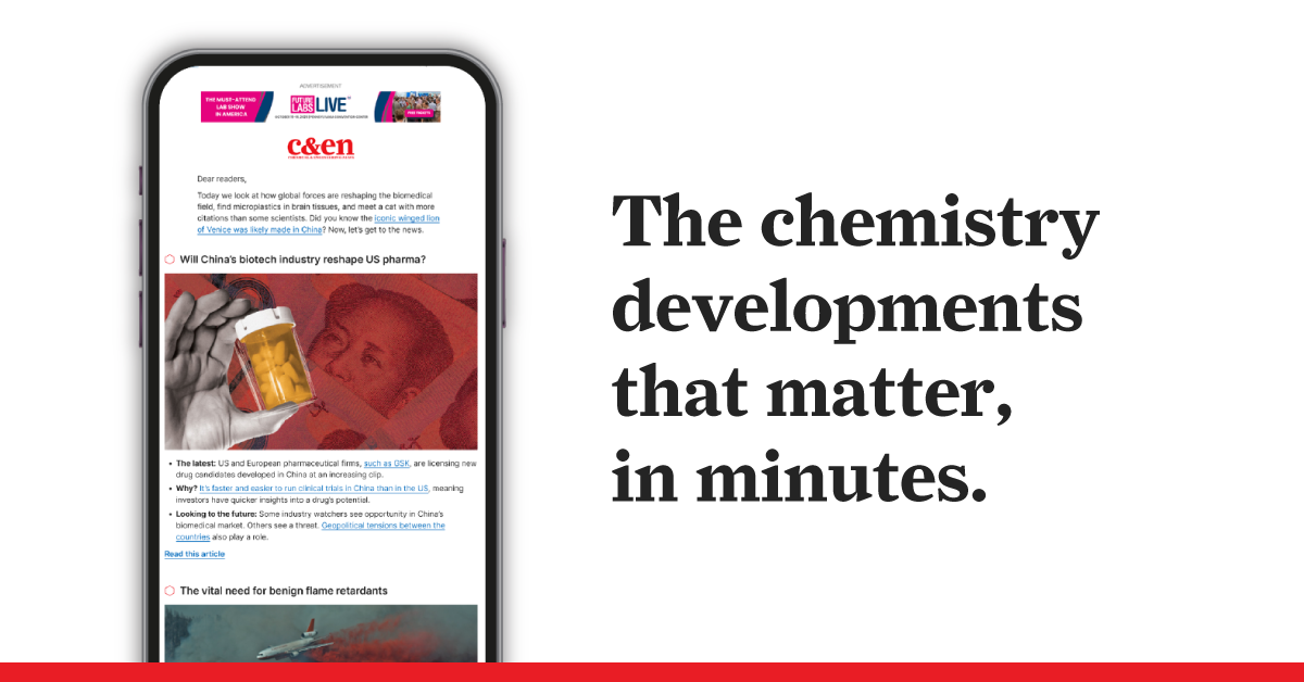 Published by the American Chemical Society for over 100 years, C&EN’s beloved print magazine remains a staple for ACS members. And now, you can access chemistry news anytime, anywhere with our free weekly newsletter for the broader chemistry community.